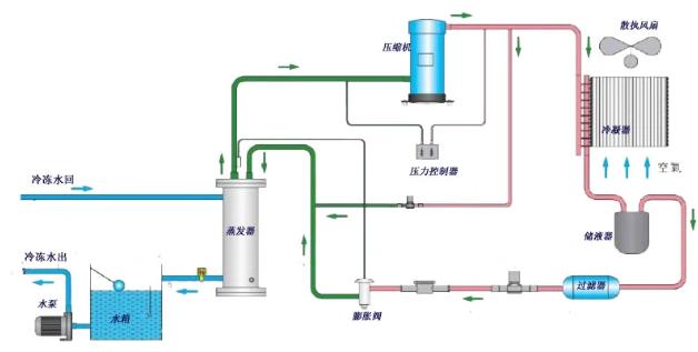 當空氣冷卻式制冷機啟動時,制冷劑吸收蒸發器中被冷卻物體的熱量并蒸發。壓縮機不斷地從蒸發器中提取產生的氣體,并將其壓縮成高溫高壓蒸汽。然后,制冷劑蒸汽被送往冷凝器,在那里與空氣進行熱交換。釋放熱量后,它凝結成液體。液體制冷劑在被膨脹閥減壓后,進入蒸發器,在那里再次蒸發,吸收冷卻物體的熱量。重復該熱交換過程,直到工業用水冷卻到所需溫度。